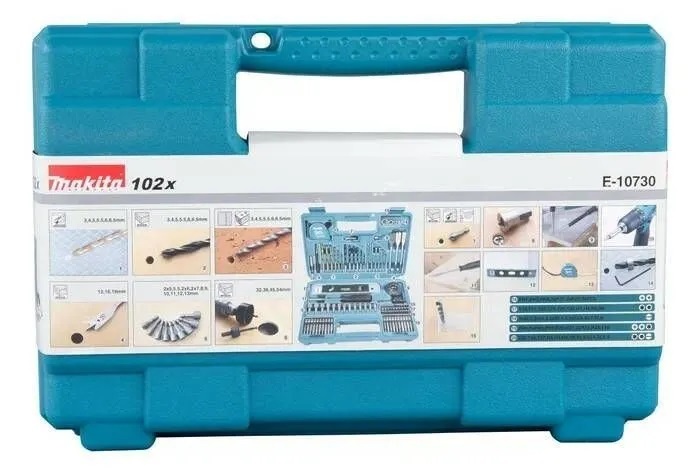 Комплект инструмента Макита Е-10730 является универсальным, ведь в его состав входят различные инструменты, позволяющие выполнять огромное количество работ в мастерской, на строительной площадке и в быту. Применяется совместно с дрелями и шуруповертами для сверления отверстий в различных материалах, а также для монтажа или демонтажа различных крепежных элементов.